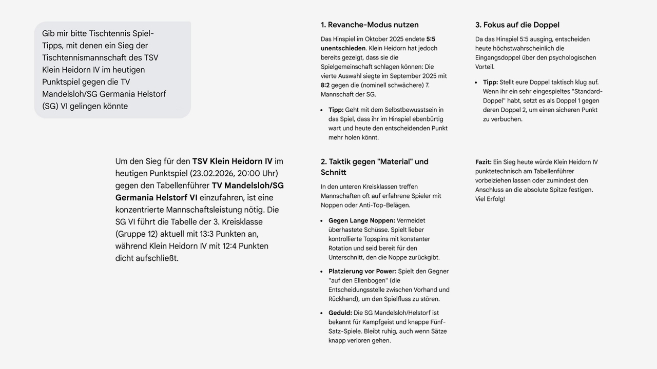 Man könnte auch von einem Vorbereitungsspiel sprechen - nach der Sieben geht es für die Tischtennisspieler dann nächste Woche gegen die Sechs. Zunächst aber stellte sich das vierte Team der Heidorner am Montagabend bei der siebten Auswahl der Spielgemeinschaft Mandelsloh/Helstorf vor und gewann die Begegnung mit 7:3. Zum kommenden Wochenbeginn wäre dann mit einem weiteren Heidorner Auswärtserfolg gegen das Damenteam (Team VI) ein schöner Sprung beim Tabellenplatz möglich. |